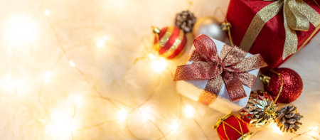 Christmas and New Year Concept. Holiday background and banner size image. Amazing Xmas decorations on real fir branches.