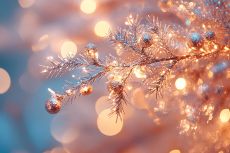 Holiday decorations with sparkling lights and bokeh in the background, capturing a warm and festive atmosphere for Christmas or New Year's celebrations.