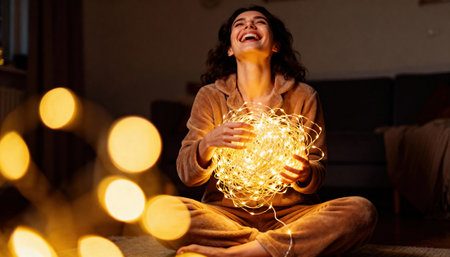 Woman holding glowing string lights sits on the floor laughing as warm bokeh lights illuminate a cozy living room atmosphere. Dark negative space above and to the side provides available space for text or design elements