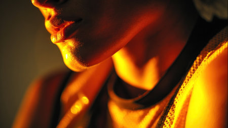 A close-up captures a woman's profile, bathed in warm, golden light. The image highlights soft textures and shadows, creating a dramatic atmosphere. The composition emphasizes the play of light and form, possibly suitable for editorial or artistic projects. The overall style is reminiscent of fine art.