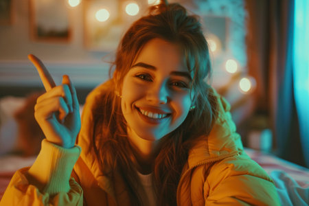A joyful young girl smiles brightly while surrounded by warm fairy lights, creating a cozy and enchanting atmosphere perfect for any festive occasion.
