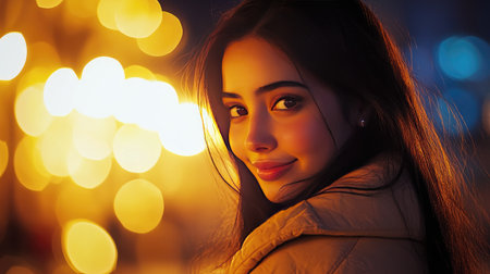 A captivating portrait of a woman smiling softly, surrounded by a warm glow of lights in the background, conveying joy and elegance in a serene nighttime setting.