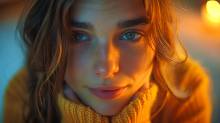 An enchanting closeup photograph of a young woman, beautifully illuminated by warm, dreamy hues of sunset