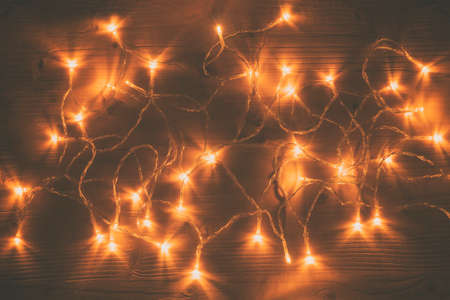 Christmas lights on wooden table background. Retro toned image.
