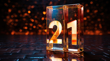 Number 21 on a glass cube. Bokeh background. AI Generative