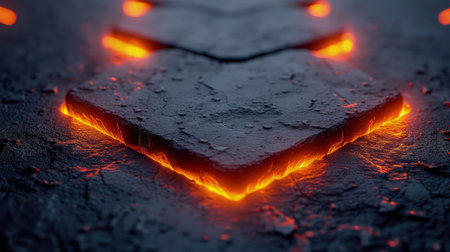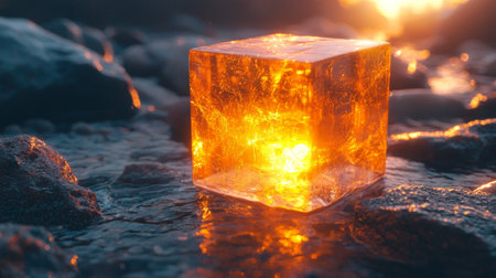 A glowing amber cube resting on a volcanic surface, creating a dramatic and otherworldly visual effect.