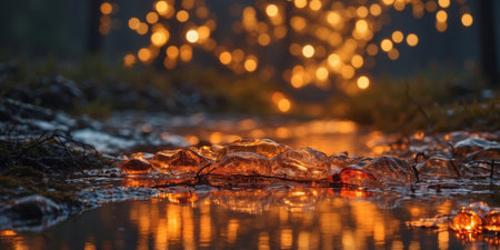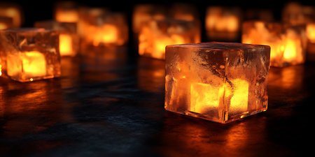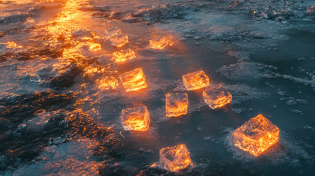 Stunning visual of glowing ice cubes on a frozen landscape during sunrise, capturing the enchanting contrast between warmth and cold.