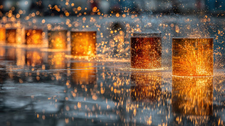 This stunning image captures vivid sparks and shimmering reflections from glowing canisters on water, creating a mesmerizing outdoor scene filled with energy.