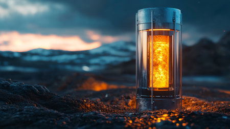 Glowing orange energy contained within a transparent cylindrical container. The metallic container stands on dark, rocky ground against a backdrop of a dramatic sunset and snowy mountains. The scene evokes a sense of mystery and futuristic technology.