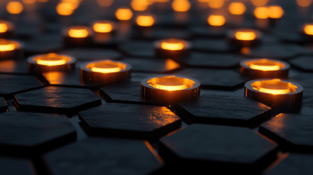 This image features a close-up of glowing hexagonal shapes arranged on a dark surface, evoking warmth and a modern aesthetic perfect for backgrounds and designs.
