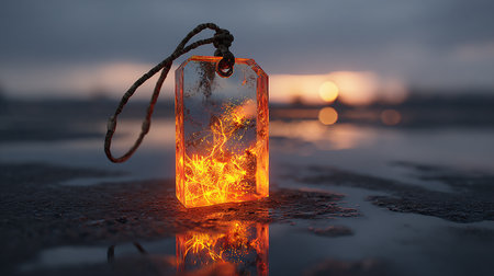 Leaves covered in frost with glowing warm light, creating a contrast between fire and ice.