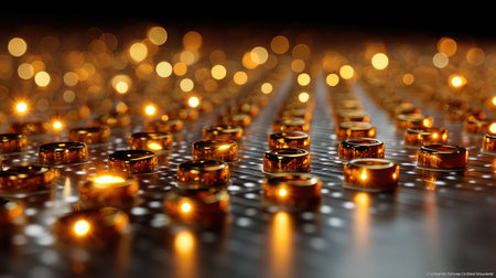 This stunning image features a close-up view of numerous golden rings placed on a reflective surface, surrounded by radiant bokeh lights, creating a mesmerizing effect.