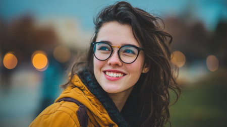 Close-up of a cheerful young adult enjoying the city ambiance with a warm, candid smile at dusk