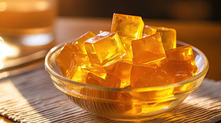 A bowl of golden orange jelly cubes, glistening under warm lighting, placed on a neutral-colored placemat