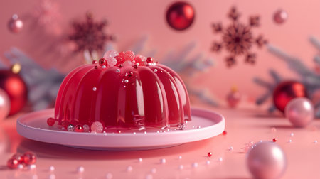 A glistening red jelly dessert topped with berries and sprinkles, presented on a pink plate, surrounded by festive Christmas ornaments.