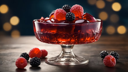 Red and orange jelly desserts with berries, served on clear plates. For use in nutritional guides, food blogs, catering services, recipe books, and dessert menus. Dark background
