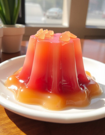 A bright and cheerful jelly dessert shaped like a cute character, sitting on a decorative plate. Perfect for adding fun to any gathering or celebration.