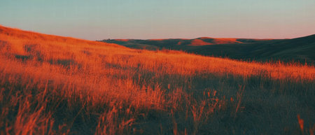 Beautiful peaceful meadow with tall grasses swaying in soft breeze under golden sunlight
