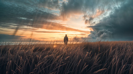 A breathtaking sunrise casts a warm golden glow over a tranquil landscape, where tall grasses gently sway in the soft breeze. The sunlight illuminates the clouds, creating a scenic and peaceful outdoor setting perfect for nature enthusiasts and photographers.