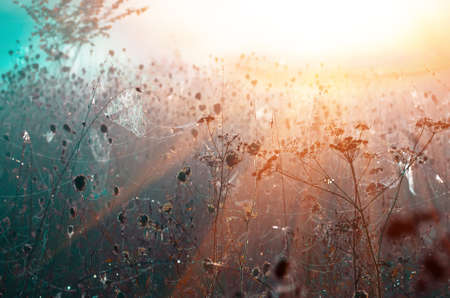 Summer Dry Autumn Grass In Sunset Sunrise Sunlight. Meadow Landscape In Fall Season. Toned Photo In Cold And Warm Colors