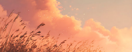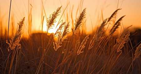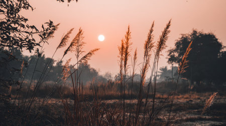 Experience the beauty of a peaceful sunrise over a grassy landscape, where silhouetted reeds sway gently, creating a calm and serene atmosphere in nature.