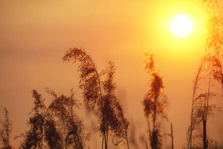 Magical golden sunset over the lake. Rural landscape. Beautiful wild nature. Sedge on the lake