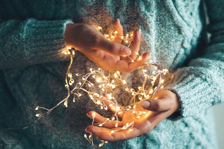 lights in the palms. Women's hands holding a garland. Girl in a blue sweater with Christmas lights in her hands, warm Christmas mood, soft focus