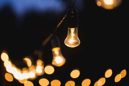 Vintage light bulb in the garden at night with bokeh background.