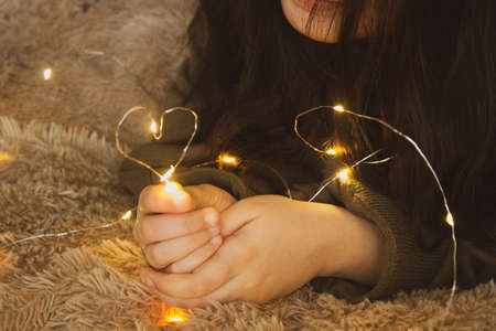 smiling happy girl lying on a blanket with a glowing garland focus on a garland.