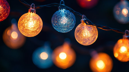 A close-up of glowing string lights featuring illuminated orange and blue bulbs with intricate textures, creating a warm, cozy, and festive atmosphere.