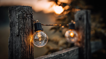 A serene outdoor scene featuring glowing string lights on a rustic wooden fence against a beautiful sunset, perfect for evoking warm, inviting gatherings.