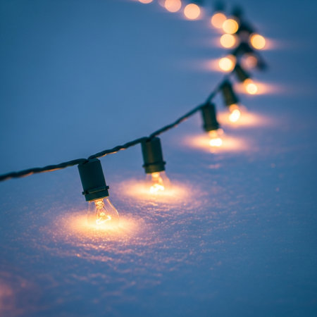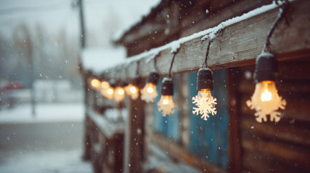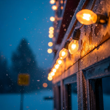 Warm Light Bulbs Glowing on a String, Creating a Cozy Atmosphere in Winter with Falling Snow