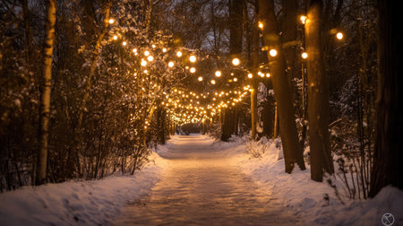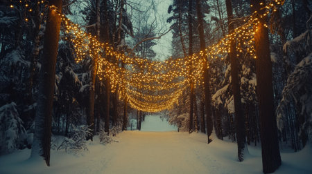 A picturesque winter pathway illuminated by glowing string lights, surrounded by trees and soft blankets of snow, creating a magical and serene ambiance.