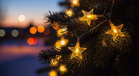 Close-up of a pine tree adorned with lights, creating a festive and warm atmosphere,.