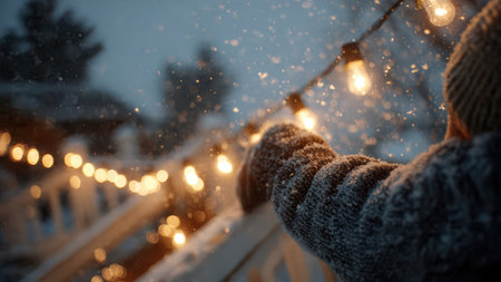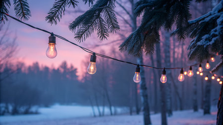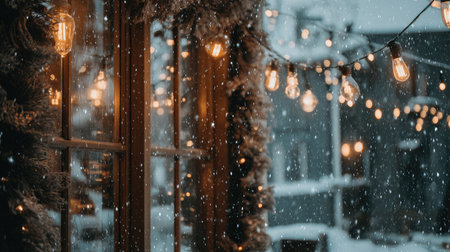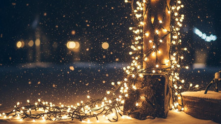 Glowing string lights illuminate a snowy winter scene. Warm and cozy atmosphere.