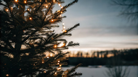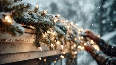 A picturesque winter scene featuring frosty pine branches with delicate snowflakes and warm glowing lights, creating a tranquil and magical atmosphere in the snow.