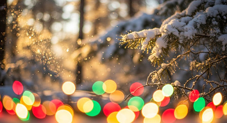 Soft mounds of snow in the foreground catch the warm glow of golden hour sunlight filtering through trees, with a string of festive lights blurred in the...