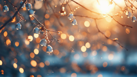 Enchanting winter scene with snow-covered branches adorned with glowing lights. This serene landscape captures the beauty and magic of the winter season.