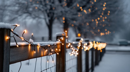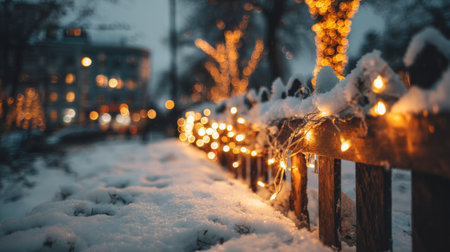A serene winter scene featuring soft snow covering a wooden fence adorned with warm lights, creating a cozy ambiance in a charming neighborhood at dusk.