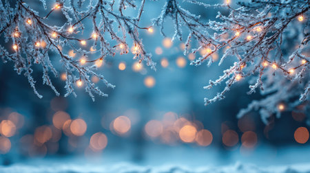 A close-up view of frosty branches illuminated by soft fairy lights, creating a serene atmosphere ideal for winter-themed projects and festive event decorations.