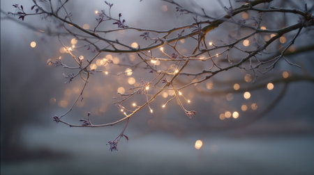 This enchanting image captures a delicate arrangement of fairy lights intertwined with bare branches, set against a soft misty background, creating a peaceful and magical atmosphere.