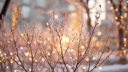 Discover a peaceful winter scene featuring delicate frosty branches illuminated by twinkling lights, evoking a serene holiday atmosphere in an urban setting.