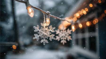 A serene winter scene featuring delicate snowflakes adorned with warm lights, creating a cozy atmosphere with gently falling snow, perfect for holiday themes.
