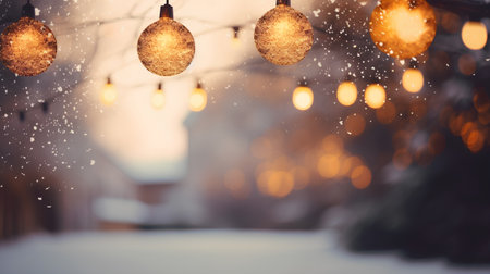 Golden showing snowy winter street scene at night with blurred warm golden christmas lights and festive decorations...