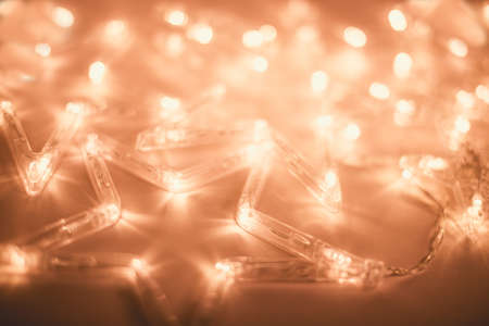 Blurred Background. Yellow or warm white color christmas lights on floor.