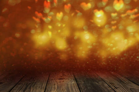 empty wooden table top with blurred light gold bokeh abstract background. For montage product display or design key visual layout