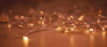 Festive Christmas garland of golden light bulbs shiny background with sequins and sparkles. Party celebration concept