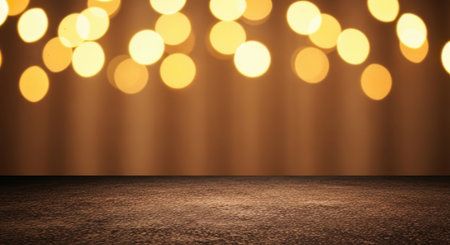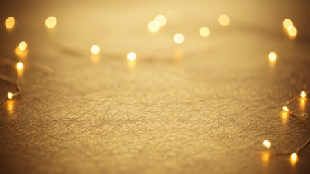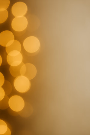 A soft focus image of golden bokeh lights against a muted background for elegant decor