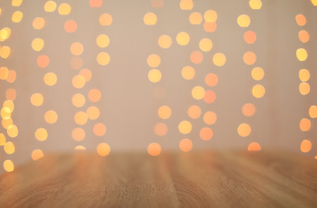 An empty rustic wooden table provides a perfect foreground for product presentation, set against a warm, blurred background of golden bokeh lights, ideal for festive and celebratory themes.