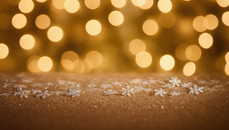 A close-up view of a textured surface with scattered snowflakes and glitter. In the background, out-of-focus golden bokeh lights create a warm and festive atmosphere. The snowflakes are delicate and crystalline, appearing to rest on a shimmering, golden-brown surface.